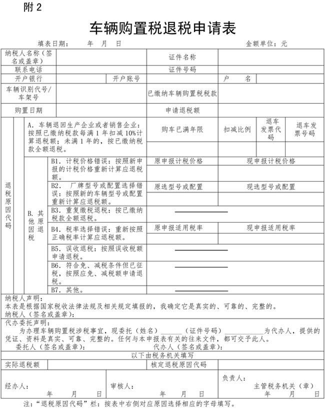 《車輛購置稅退稅申請表》填表說明 1.本表由車輛購置稅納稅人在辦理退稅申請時填寫(打印),由納稅人簽章確認。 2.“納稅人名稱”欄,填寫辦理退稅申報時提供的納稅人證件上注明的名稱。 3.“證件名稱”欄,單位納稅人填寫《統(tǒng)一社會信用代碼證書》或者《營業(yè)執(zhí)照》或者其他有效機構證明;個人納稅人填寫《居民身份證》或者其他身份證明名稱。 4.“證件號碼”欄,填寫“證件名稱”欄填寫的證件的號碼。 5.“開戶銀行”“賬號”“戶名”欄,填寫納稅人用來接收國庫退稅稅款的開戶銀行、賬號及開戶名稱。 6.“車輛識別代號/車架號”欄,按車輛合格證或者《中華人民共和國海關貨物進口證明書》或者《中華人民共和國海關監(jiān)管車輛進(出)境領(銷)牌照通知書》或者《沒收走私汽車、摩托車證明書》中對應的車輛識別代號(車架號)填寫。 7.“已繳納車輛購置稅稅款”欄,填寫主管稅務機關開具的車輛購置稅繳稅憑證上注明的繳稅金額。 8.“購置日期”欄,填寫機動車銷售統(tǒng)一發(fā)票(或者有效憑證)上注明的開票日期。 9.“申請退稅額”欄,填寫納稅人向稅務機關申請的退稅金額。 10.“退稅原因代碼”欄,按表中右側對應原因選擇相應的字母填寫。 11.本表(一車一表)一式三份,一份由納稅人留存;一份由國庫留存;一份由主管稅務機關留存。