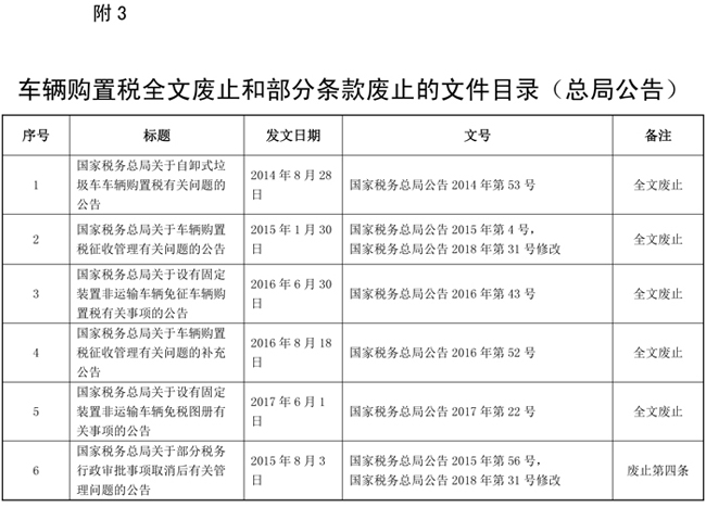 為落實《中華人民共和國車輛購置稅法》(以下簡稱《車購稅法》),規(guī)范車輛購置稅征收管理,現就有關事項公告如下: 一、車輛購置稅實行一車一申報制度。 二、《車購稅法》第六條第四項所稱的購置應稅車輛時相關憑證,是指原車輛所有人購置或者以其他方式取得應稅車輛時載明價格的憑證。無法提供相關憑證的,參照同類應稅車輛市場平均交易價格確定其計稅價格。無同類應稅車輛市場平均交易價格的,由稅務機關依據《中華人民共和國稅收征收管理法》(以下簡稱《稅收征管法》)及其實施細則核定其應納稅額。 原車輛所有人為車輛生產或者銷售企業(yè),未開具機動車銷售統(tǒng)一發(fā)票的,按照車輛生產或者銷售同類應稅車輛的銷售價格確定應稅車輛的計稅價格。無同類應稅車輛銷售價格以及同類應稅車輛無銷售價格的,按照組成計稅價格確定應稅車輛的計稅價格。 三、購置應稅車輛的納稅人,應當到下列地點申報納稅: (一)需要辦理車輛登記的,向車輛登記地的主管稅務機關申報納稅; (二)不需要辦理車輛登記的,單位納稅人向其機構所在地主管稅務機關申報納稅,個人納稅人向其戶籍所在地或者經常居住地的主管稅務機關申報納稅。 四、《車購稅法》第十二條所稱納稅義務發(fā)生時間,按照下列情形確定: (一)購買自用應稅車輛的為購買之日,即車輛相關價格憑證的開具日期; (二)進口自用應稅車輛的為進口之日,即《海關進口增值稅專用繳款書》或者其他有效憑證的開具日期; (三)自產、受贈、獲獎或者以其他方式取得并自用應稅車輛的為取得之日,即合同、法律文書或者其他有效憑證的生效或者開具日期。 五、納稅人辦理納稅申報時應當如實填報《車輛購置稅納稅申報表》(附件一,以下簡稱《納稅申報表》),同時提供車輛合格證明和車輛相關價格憑證。 六、納稅人在辦理車輛購置稅免稅、減稅時,除按本公告第五條規(guī)定提供資料外,還應當根據不同的免減稅項目,分別提供以下資料的原件或者復印件: (一)外國駐華使館、領事館和國際組織駐華機構及其有關人員自用車輛,提供機構證明和外交部門出具的身份證明。 (二)城市公交企業(yè)購置的公共汽電車輛,提供所在地縣級以上(含縣級)交通運輸主管部門出具的公共汽電車輛認定表。 (三)懸掛應急救援專用號牌的國家綜合性消防救援車輛,提供中華人民共和國應急管理部批準的相關文件。 (四)回國服務的在外留學人員購買的自用國產小汽車,提供海關核發(fā)的《中華人民共和國海關回國人員購買國產汽車準購單》。 (五)長期來華定居專家進口自用小汽車,提供國家外國專家局或者其授權單位核發(fā)的專家證或者A類和B類《外國人工作許可證》。 七、免稅、減稅車輛因轉讓、改變用途等原因不再屬于免稅、減稅范圍的,納稅人在辦理納稅申報時,應當如實填報《納稅申報表》。發(fā)生二手車交易行為的,提供二手車銷售統(tǒng)一發(fā)票;屬于其他情形的,按照相關規(guī)定提供申報材料。 八、已經繳納車輛購置稅的,納稅人向原征收機關申請退稅時,應當如實填報《車輛購置稅退稅申請表》(附件二,以下簡稱《退稅申請表》),除提供納稅人身份證明外,還應當按照下列情況分別提供以下資料: (一)車輛退回生產企業(yè)或者銷售企業(yè)的,提供生產企業(yè)或者銷售企業(yè)開具的退車證明和退車發(fā)票。 (二)其他依據法律法規(guī)規(guī)定應當退稅的,根據具體情形提供相關資料。 九、納稅人應如實申報應稅車輛的計稅價格。 納稅人沒有編造虛假計稅依據的,稅務機關按照其申報的計稅價格征收稅款;納稅人編造虛假計稅依據的,稅務機關依照《稅收征管法》及其實施細則的相關規(guī)定處理。 十、稅務機關追繳稅款時,納稅人無法按照規(guī)定提供申報資料的,可以依據司法、審計、財政等有關機關的文書,為其辦理補稅手續(xù)。 十一、本公告要求納稅人提供的資料,稅務機關能夠通過政府信息共享等手段獲取相關資料信息的,納稅人不再提交。 十二、本公告所稱的納稅人身份證明:單位納稅人為《統(tǒng)一社會信用代碼證書》或者營業(yè)執(zhí)照或者其他有效機構證明,個人納稅人為居民身份證或者居民戶口簿或者入境的身份證件。 本公告所稱車輛合格證明為整車出廠合格證或者車輛電子信息單。 本公告所稱車輛相關價格憑證,境內購置車輛為機動車銷售統(tǒng)一發(fā)票或者其他有效憑證,進口自用車輛為《海關進口關稅專用繳款書》或者海關進出口貨物征免稅證明。屬于應征消費稅車輛的還包括《海關進口消費稅專用繳款書》。 十三、稅務機關應當在稅款足額入庫或者辦理免稅手續(xù)后,將應稅車輛完稅或者免稅電子信息,及時傳送給公安機關交通管理部門。 上款所指稅款足額入庫的情形包括:納稅人到銀行辦理車輛購置稅稅款繳納(轉賬或者現金)由銀行將稅款繳入國庫的,國庫已傳回《稅收繳款書(銀行經收專用)》聯(lián)次;納稅人通過橫向聯(lián)網電子繳稅系統(tǒng)等電子方式繳納稅款的,稅款劃繳已成功;納稅人在辦稅服務廳以現金方式繳納稅款的,主管稅務機關已收取稅款。 十四、納稅人名稱、車輛廠牌型號、發(fā)動機號、車輛識別號、證件號碼等應稅車輛完稅或者免稅電子信息與原申報資料不一致的,納稅人可以到稅