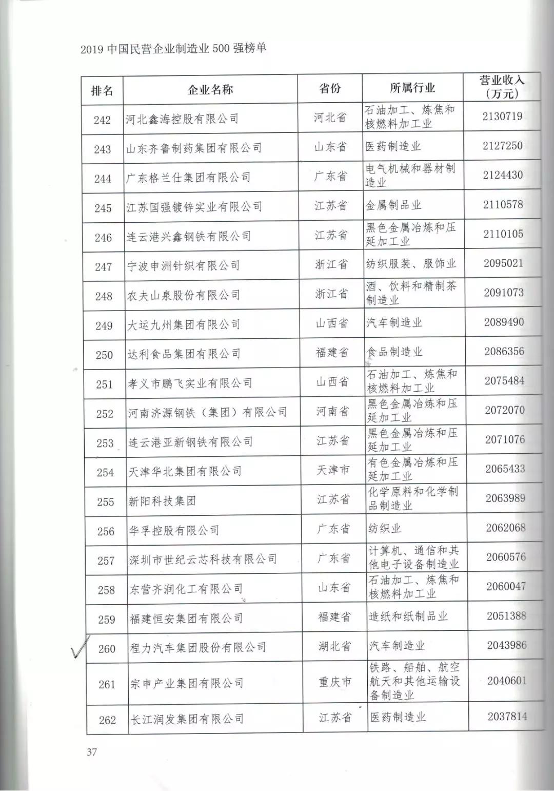 湖北程力汽車集團入選2019年中國民企500強及中國民企制造業500強榮譽榜單