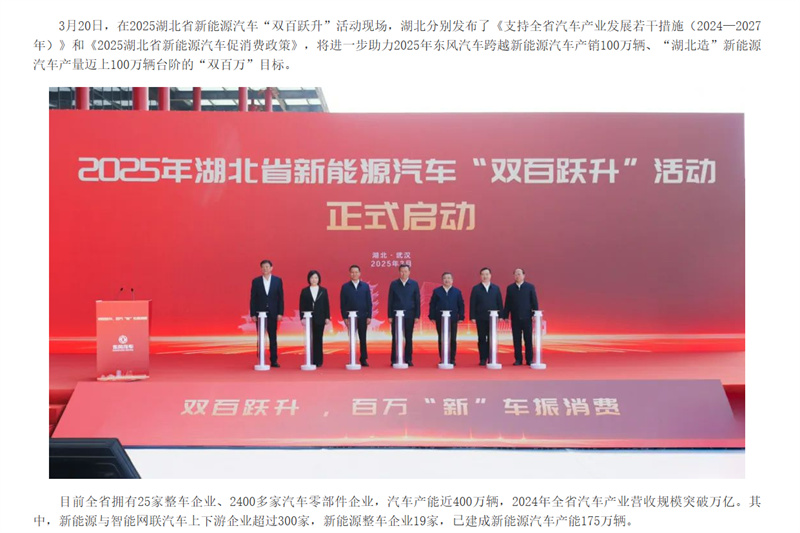 3月19日 (下午)三部門聯(lián)合升級貨車更新政策:交通運輸部、發(fā)改委、財政部將老舊貨車補貼范圍擴展至國三/國四排放車輛,取消燃料類型限制。根據(jù)新規(guī),提前報廢并更換新能源貨車的企業(yè)最高可獲14萬元/車補貼,購置國六車型補貼7萬元。政策特別設(shè)置"綠色通道",對參與氫燃料電池車示范運營的企業(yè)額外給予3萬元運營補貼。支持資金按照總體9:1的原則實行央地共擔(dān)。 3月20日 湖北省確定汽車產(chǎn)業(yè)“雙百萬”目標(biāo) 湖北省分別發(fā)布了《支持全省汽車產(chǎn)業(yè)發(fā)展若干措施(2024—2027年)》和《2025湖北省新能源汽車促消費政策》,將進一步助力2025年“湖北造”新能源汽車產(chǎn)量邁上100萬輛臺階的目標(biāo)。 3月21日 大同構(gòu)建新能源商用車生態(tài)圈 3月29日 央企重組開啟產(chǎn)業(yè)新格局 3月,財政部的扶持政策不僅延長了購置稅減免期限,還加大了對充換電基礎(chǔ)設(shè)施和智能網(wǎng)聯(lián)技術(shù)的投入,為新能源專用車的市場推廣和基礎(chǔ)設(shè)施建設(shè)提供了有力保障。此外,三部門聯(lián)合升級的貨車更新政策,提供了豐厚的補貼,將促進新能源專用車的銷售。湖北省確定汽車產(chǎn)業(yè)“雙百萬”目標(biāo)不僅為當(dāng)?shù)?/span>提供了政策支持和市場需求保障,還促進了產(chǎn)業(yè)鏈的協(xié)同發(fā)展和新能源專用車的普及推廣。這一系列政策將有助于推動新能源專用車產(chǎn)業(yè)的快速發(fā)展和壯大。 |