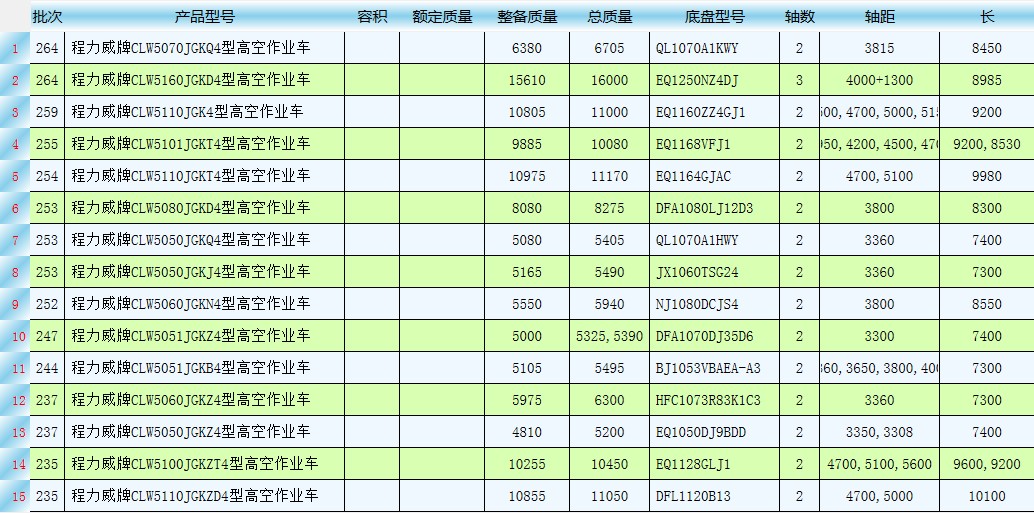 | 程力專用汽車股份有限公司注冊資金一億五千萬元,占地六百多畝,是政府定點采購企業、湖北省高新技術企業、湖北省消費者滿意單位、湖北省守合同重信用企業,公司“程力威”商標是中國馳名商標,公司產品是湖北名牌產品。公司先后通過ISO9001-2008國際質量管理體系認證,3C國際強制產品認證,以及出口產品的各項認證。 高空作業車是由液壓或電動系統支配多只液壓油缸,上下舉升載人作業的一種車輛,施工人員借助高空作業車升空作業。 我公司主要生產剪叉式高空作業車和折疊臂式高空作業車。 剪叉式高空作業車的剪叉機械結構,使升降臺起升有較高的穩定性,寬大的作業平臺和較高的承載能力,使高空作業平臺面積更大,適合多人同時作業,高空作業效率更高。 折疊臂式高空作業車移動方便,臂結構緊湊,強度高,重量輕,采用車輛自身動力啟動,架設速度快,工作臺既可升高又可延伸,還可以360度旋轉,易于跨越障礙物到達工作位置,是理想的高空作業設備。我公司生產的折疊臂式高空作業車都是360度轉臂,液壓控制,上下操作,帶四支腿,作業高度12米以下二節直臂,12米以上三節直臂,12米以上還帶有吊鉤,方便作業。我公司在保證質量的前提下,價格絕對給您最優惠。湖北程力高空作業車為了適應市場需求,新增一批高端國四高空作業車產品,具體參數如下: ![]() ![]() 具體需要了解更多湖北程力國四高空作業車參數,湖北程力高空作業車價格,湖北程力高空作業車圖片可以