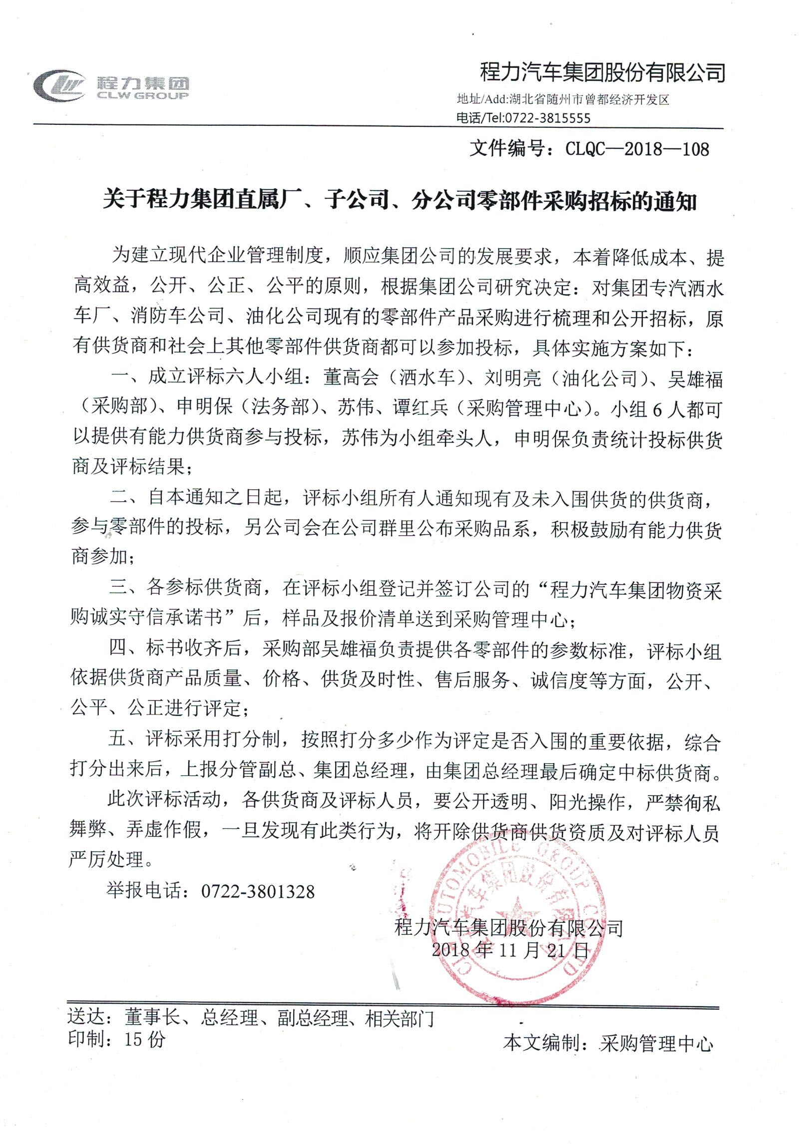 關(guān)于湖北程力汽車所有零部件招投標(biāo)活動(dòng)公示: 湖北程力公司正在進(jìn)行所有程力公司所用的所有零部件及配套件(含所有的灑水車、環(huán)衛(wèi)車、化工車、消防車、罐式車等)招投標(biāo)活動(dòng),我們需要供應(yīng)商或從事此方面的專業(yè)人員踴躍投標(biāo),公司對所有的供應(yīng)商一視同仁、不偏不倚,嚴(yán)格按照公開、公正、公平原則進(jìn)行招投標(biāo)工作,所有投標(biāo)人員只要性價(jià)比合理均有可能會(huì)中標(biāo),請公司各位員工積極介紹認(rèn)識(shí)的相關(guān)能配套的人員或公司投標(biāo)。 |