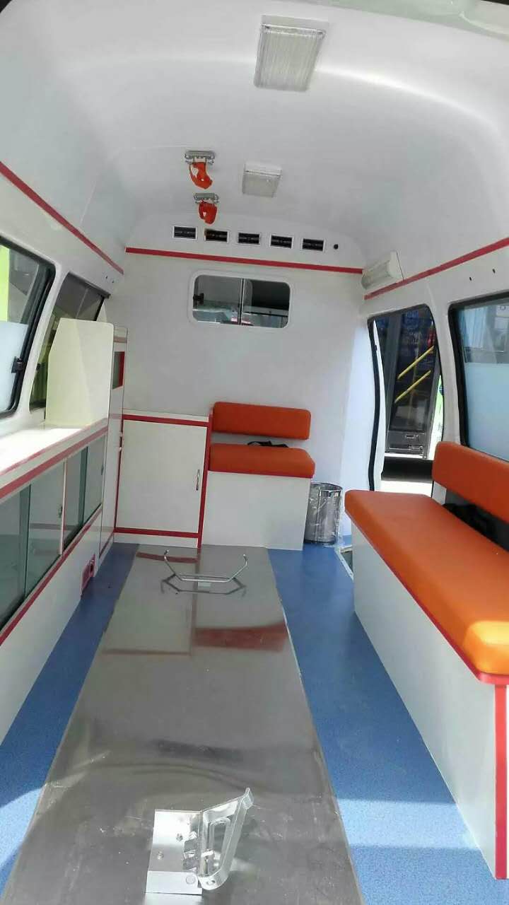 1、便攜折疊式擔架1件;2、醫藥柜1件;3、固定安裝氧氣瓶1只;4、輸液吊鉤2只;5、消毒燈1只;6、污物桶1只;7、單人座椅3只;8、長條貯藏柜帶2人位軟座墊、軟靠背和安全帶1套;9、中隔斷帶鋁合金滑窗1套;10、前頂裝全藍警燈警報器1套;11、照明燈2只;12、逆變器1只;13、電源插座1組;14、中門上車扶手;15、后門上車踏板;16、醫用耐磨塑膠地板革;17、貼救護十字標志;廠家銷售熱線:13872882215.