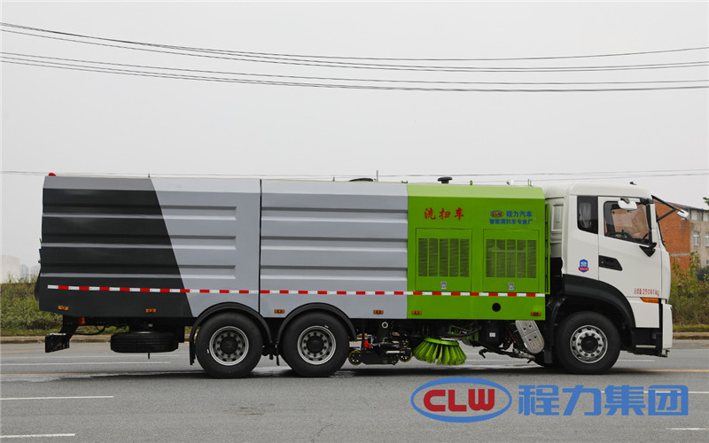 東風(fēng)天龍洗掃車(chē)副發(fā)動(dòng)機(jī)驅(qū)動(dòng)風(fēng)機(jī)和高壓水泵,副發(fā)動(dòng)機(jī)采用東風(fēng)康明期6缸柴油發(fā)動(dòng)機(jī)。 風(fēng)機(jī)用8.0高壓離心風(fēng)機(jī),效率高、風(fēng)量大,最高風(fēng)量達(dá)23500m3/h。 東風(fēng)天龍洗掃車(chē)高壓水泵采用同際知名T7012IR 型柱塞柱,流量合適,壓力高,允許最高壓力達(dá)10MPa,清水箱充分利用了車(chē)載空間,容積大,容積達(dá)12m3。 東風(fēng)天龍洗掃車(chē)?yán)洳捎脝螌硬讳P鋼結(jié)構(gòu),傾翻卸料,帶高壓位自潔裝置。自潔裝置可在垃圾箱卸料時(shí)幫助卸料,清洗垃圾箱內(nèi)部。 東風(fēng)天龍洗掃車(chē)左右立掃為單掃盤(pán),減少了掃刷數(shù)量和掃刷消耗量,能降低使用成本。左右立掃分開(kāi)控制,可實(shí)現(xiàn)左掃、右掃和全掃等不同作業(yè)模式。寬吸嘴的吸口寬度達(dá)到2418mm,確保作業(yè)總寬度大于3.5mm。 湖北程力國(guó)六東風(fēng)天龍后雙橋大型洗掃4個(gè)高度可調(diào)的吸嘴輪,能方面調(diào)整和保證吸嘴與路面間的合理間隙。吸嘴內(nèi)高有噴水桿,盡可能多地將高壓洗滌噴嘴布置在吸嘴內(nèi)部,不但清洗效果好,還能最大限度減少高壓水氣流沖起污物產(chǎn)生的二次污染。左右噴水桿安裝在吸嘴上,隨吸嘴升降,結(jié)構(gòu)簡(jiǎn)單緊湊,保證噴水桿的離地高度固定不變,達(dá)到最佳清洗效果。 東風(fēng)天龍洗掃車(chē)開(kāi)式液壓系統(tǒng)驅(qū)動(dòng)左右立掃升降、左右掃肋旋轉(zhuǎn)、吸嘴升降、垃圾箱后門(mén)開(kāi)閉、垃圾箱傾翻復(fù)位等機(jī)械動(dòng)作。底盤(pán)變速箱側(cè)取力器驅(qū)動(dòng)低壓水泵,實(shí)現(xiàn)灑水車(chē)的低壓沖洗功能。一鍵式作業(yè)起動(dòng)和停機(jī)操作。 東風(fēng)天龍大型洗掃車(chē)具有路面清洗、路面清掃、路緣清洗、路緣和路緣石立面洗刷、低壓沖洗、噴霧除塵等多功能。有“全洗掃”、 “左洗掃”、 “右洗掃”、 “全掃”、 “左掃”、 “右掃”6種作業(yè)模式可選擇。選擇“全洗掃”模式清洗廣場(chǎng)和路面,清洗效率高效果好,洗凈率達(dá)90%以上。選擇“左洗掃”或“右洗掃”模式清洗路面和路緣、洗刷路緣石立面。需要進(jìn)行路面清掃或路面保潔作業(yè)時(shí),可選擇掃路模式。需要噴霧除塵時(shí),可開(kāi)啟噴霧裝置,進(jìn)行噴霧除塵作業(yè)。可以像灑水車(chē)一樣對(duì)路面進(jìn)行低壓沖洗作業(yè)。 東風(fēng)天龍大型洗掃車(chē)適用于城市道路、高速公路、廣場(chǎng)、機(jī)場(chǎng)、碼頭、遂道、橋梁、隔離墻避、路緣和路緣石立面的機(jī)械化清洗、清掃、噴霧降塵等清潔作業(yè)。