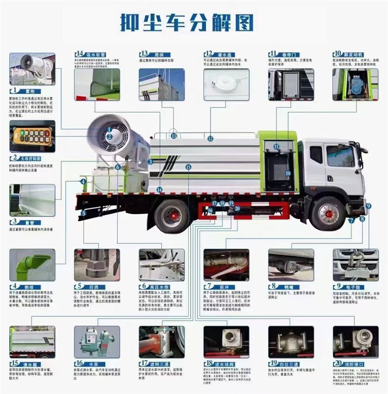 底盤配置:采用國六東風新款多利卡D9系列底盤生產,軸距4500mm,底盤發動機為康明斯230馬力,295真空胎,東風6檔變速箱,國六排放標準,罐體容積:10立方,罐體鋼板采用Q235碳鋼鋼板,采用方形瓦楞設計,外觀大氣靚麗,后工作平臺加裝高效率車載式風送噴霧機,噴藥炮霧化效果好,可遠程噴霧,東風多利卡D9抑塵車帶前沖后灑、側噴、平臺高炮、自流閥及消防接頭各1個、標配億豐泵或金龍泵,可選裝50-100米噴霧機。 上裝配置:罐體容積10立方,罐體為方形罐,罐體內部做防腐,主管路鍍鋅,帶前部沖洗路面噴灑裝置、后部扇形降塵噴灑裝置,兩側面噴灑裝置,帶后部工作平臺、平臺上安裝綠化灑水炮(炮噴射形狀可調),可調直沖狀、大雨、中雨、毛毛雨,可連續調節,采用中聯唯佳大流量水泵,消防接口可自流,音樂喇叭,50-100米噴霧機組。 噴霧機配置:TDM-M08型,可無線操作,及手動操作。根據需求選配的霧炮機霧化距離在60-120米不等(靜風室內距離),實際射程:(霧化射程會受濕度、溫度、風速等各方面天氣因素的影響,另外天氣干燥地區一部分在空中被蒸發掉)。CLW-100型60米,副發電機組功率50(Kw),風機功率15(Kw),不銹鋼多級離心泵功率5.5(Kw)。100米無線操作,霧化距離60米(靜風室內距離)實際射程:(霧化射程會受濕度、溫度、風速等各方面天氣因素的影響,另外天氣干燥地區一部分在空中被蒸發掉)。 湖北程力國六東風D9方罐抑塵車程力威牌CLW5180TDYD6型多功能抑塵車圖片價格: